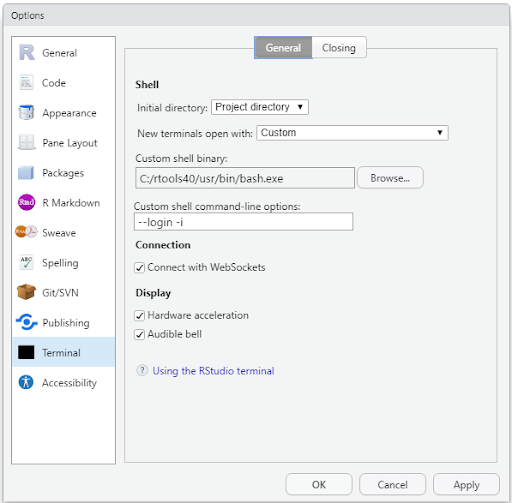 Using The Rstudio Terminal Rstudio Support from support.rstudio.com In the next window, select the path environment. I installed git on my windows 10 a couple of months ago. Git bash installation is much simpler than compared to linux. The easiest guide to git bash for windows download and, the basic configurations needed to install git bash commands to manage your repositories. Installing git on windows bash and installing git on windows in this way is. In the configuring the terminal emulator to use with git bash window, select use mintty (the default terminal of msys2). On the configuring extra options window, leave. I use windows defender antivirus, and it is not making my bash slow.